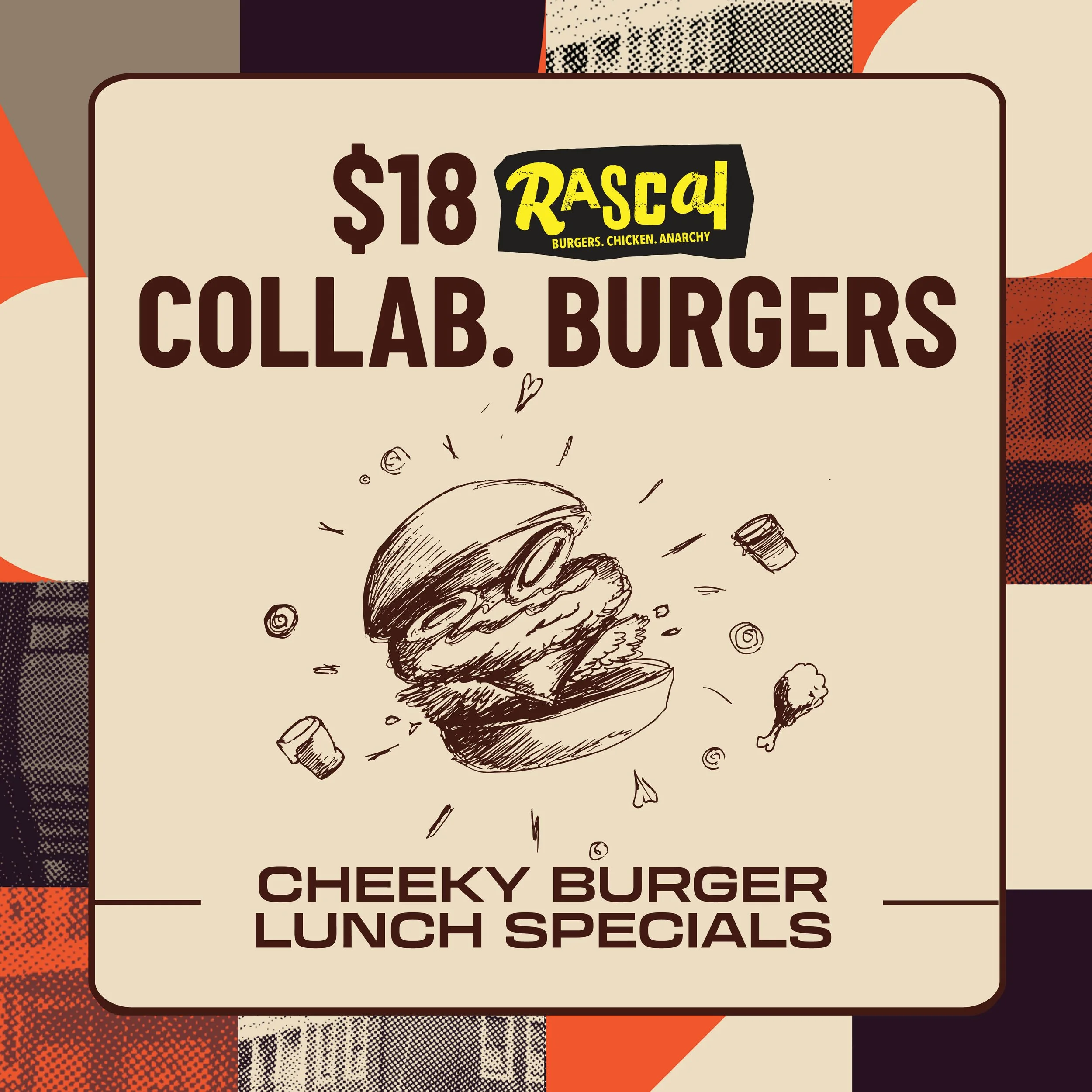JOIN US FOR A CHEEKY MIDWEEK LUNCH BURGER- 3 BURGERS TO CHOOSE FROM- BEEF, CHICKEN OR FISH, MADE FOR YOU HERE AT THE MARYVILLE, EXPERTLY SEASONED WITH RASCAL KNOW-HOW.